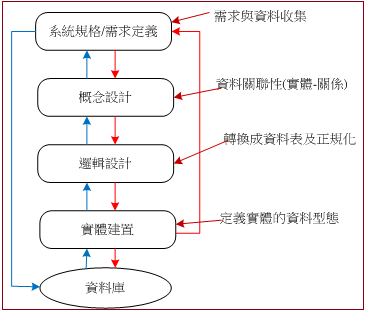 設計一套資料庫最基礎的方法,是思考如何將真實環境利用圖形將它的運作流程繪出來,再將它表格化。這裡面有一些方法,我們會詳加說明。首先,我們來看一般教科書所說的建立步驟如圖 9-1所示,以下說明各個階段的工作。
