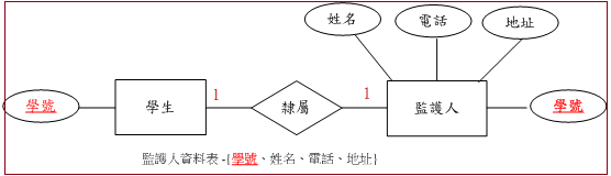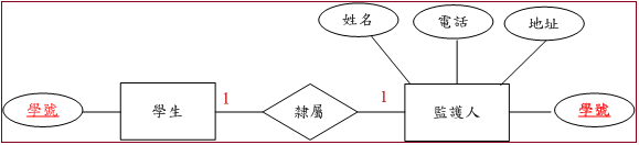 我們用學生與監護人之間關係來說明一對一關係,假設每一位學生只有一位監護人,每一位監護人也僅隸屬一位學生,如圖 9-8所示。