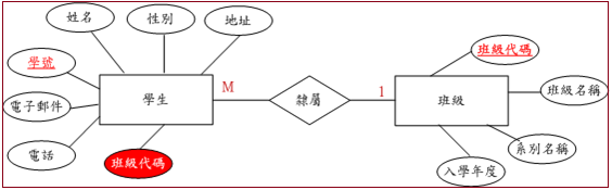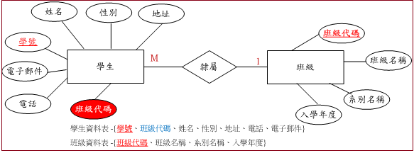 既然,學生要與班級建立隸屬關係,只好在學生個體中增加『班級代碼』屬性,用來表示他是哪一個班級的學生,也稱之為『外來鍵』。一個班級可能擁有若干個學生,因此,班級與學生之間的關係是『多對一,M:1』,我們在圖示表示哪一個是多(M)、哪一個是一(1)。