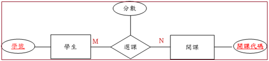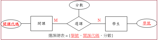 圖 9-7是多對多的範例,系統設計學生同時可以修讀多門課,每一門課也可以讓多位學生選讀。另外,關係也可以附加屬性,譬如圖(七)中,選課關係增加『分數』的屬性,其用來記錄學生修讀的分數。