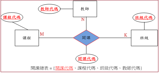 開課關係是複雜且多對多的關係,表示同一學期教師可以開多門課、每班也可開多門課、每一課程也可以讓不同老師在不同班級開課,如圖 9-13。我們將此關係定名為『開課總表』,他的屬性可以 {課程代碼、班級代碼、教師代碼}等三個屬性,並組合成主鍵。如果這樣的話,當它當別資料表的『外來鍵』時,該資料表也要建立這三個欄位,就會很浪費空間,因此,我們再增加一個『開課代碼』之欄位,並選定它為主鍵。