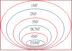 正規化之目的是要檢測資料表是否符合減少重複性與避免資料更新的異常,但這兩者常常相違背,如果資料要越安全,資料表可能需要分割越精細,這樣一來,會增加查詢資料的困難。如果我們用另外的角度來看,資料表設計也許有漏洞,但可以永遠不會去觸動它,此種漏洞也許可以容忍它存在,如此設計資料表就可以簡單許多。也就是說,正規化並不需要要求非常嚴謹,只要能符合環境需求就可以了。在下圖中顯示正規化的階層架構有 1NF、2NF、3NF、BCNF、4NF、以及PJ/NF等六個層次,越高層次所要求條件越高,資料表可能被分割得越細,一般系統應用只到 3NF 或 BCNF 就不錯了,我們也討論到這個層次就好。