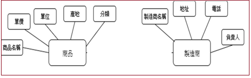 我們將此資料庫定名為:Trader_db。由上面資料可以看出,包含產品、製造商等兩個實體,我們先將兩實體分類如下:(請利用 draw.io 繪製)