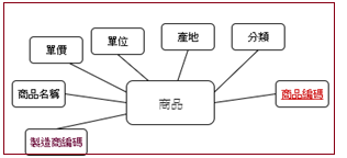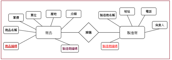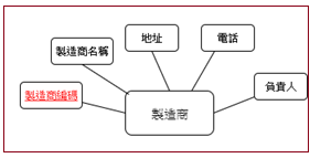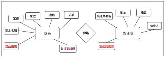 商品實體內缺少唯一識別值,我們增加了一個『商品編碼』屬性,每一個產品都有一個獨立編碼。同樣的,也許會有相同名稱的製造商,因此,在製造商實體中,也增加了一個『製造商編碼』的屬性。如此兩實體之間並沒有關聯性,吾人在商品實體內再增加一個『製造商編碼』,並將其設定為『外來鍵』參考到製造商實體的『製造商編碼』的屬性上,如下圖所示: