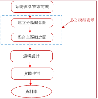 在此階段不需考慮資料的儲存及處理等問題,主要是分析及整理收集到的資料,產生一個能符合使用者需求的資料庫模型。一般都用 E-R 模式的圖形來製作。通常我們將此階段再細分為兩個階段:第一個階段是建立分區的概念設計;其次再將各分區設計整合成全區的概念設計,當然這些設計過程都使用 E-R 圖形來規劃,如圖 9-2。