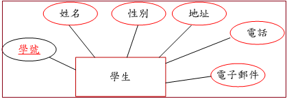 在真實環境裡,無論有形或無形的個體,都稱為實體。每一個實體是由若干個屬性來描述它的特質。圖 9-4 是表示學生的個體,它是由學號、姓名、性別、地址、電話與電子郵件等屬性來描述。為了達成每一筆記錄代表一個學生,學生之間不可重複,我們發現僅有『學號』滿足條件(1. 不可重複性、2. 最小性),因此我們選擇它為主鍵。