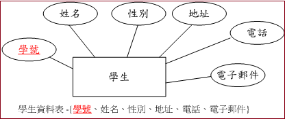 我們用學生實體來說明如何將實體轉換為資料表,如圖 9-9。將此實體取名為『學生資料表』= {學號、姓名、班級代碼、性別、地址、電話、電子郵件},其中有底線者表示為主鍵。